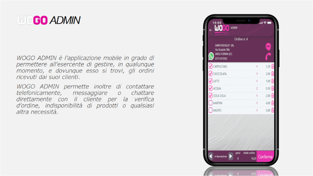 Con WOGO permetti ai clienti di interagire con il tuo catalogo prodotti, creare carrelli ed inviarti un ordine o una prenotazione, in modo facile e veloce.